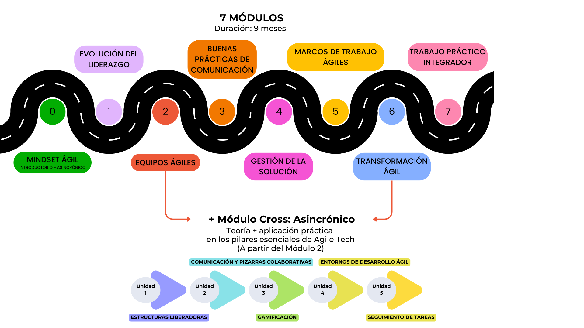 De modalidad asincrónica, este módulo se ha diseñado con contenidos de introducción a los conceptos generales de la Agilidad para garantizar los conocimientos mínimos y una nivelación básica entre participantes de diferentes industrias, roles, responsabilidades y experiencia. Serán 4 cápsulas de contenidos online (videos) que se disponibilizarán en el web campus, previo al inicio de la cursada.